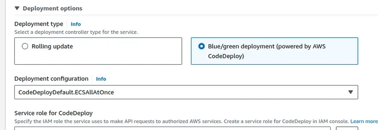 5. Deployment Type: Under Deployment type, select Blue/Green deployment (powered by CodeDeploy).